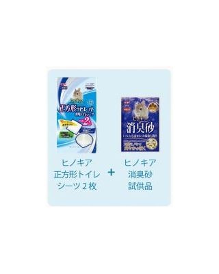 - サイズ::幅240×奥行き240×高さ160mm、重量:540g、セット内容:正方形トイレラビレット 、ヒノキア正方形トイレシーツ2枚、ヒノキア消臭砂試供品