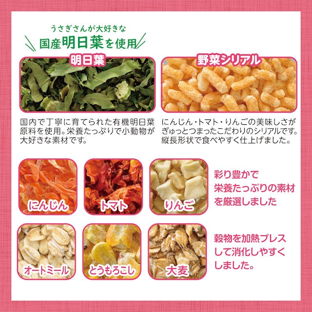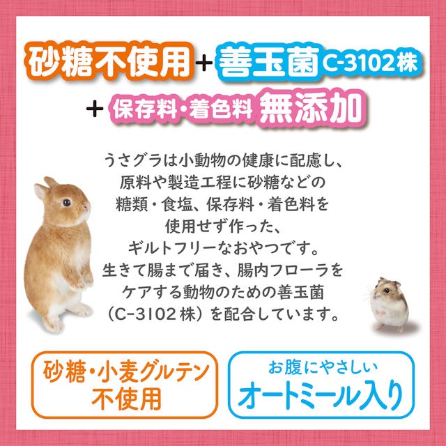 ●うさグラは小動物の健康に配慮し、原料や製造工程に砂糖などの糖類・食塩、保存料・着色料を使用せず作った、ギルトフリーなおやつです。生きて腸まで届き、腸内フローラをケアする動物のための善玉菌(C-3102株)を配合しています。●国内で丁寧に育てられた有機明日葉原料を使用。栄養たっぷりで小動物が大好きな素材です。●毎日のおやつやペレットに振りかけることで、自然のビタミンやミネラル・食物繊維などの栄養素をたっぷり摂取できるグラノーラです。●小麦グルテン不使用。お腹にやさしいオートミール入り。好きないちごたっぷり!砂糖不使用、保存料・着色料無添加、生きて腸まで届く善玉菌配合のギルトフリーおやつ。うさぎの健康を考えて素材を厳選。小麦グルテン不使用。