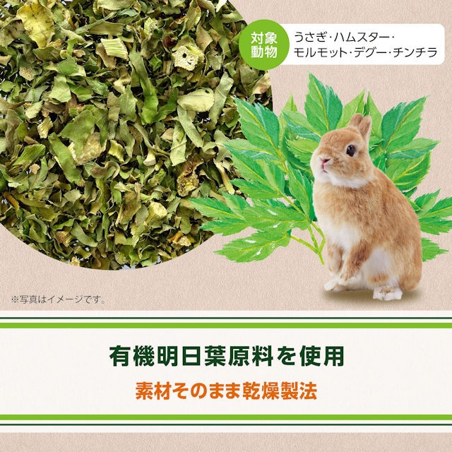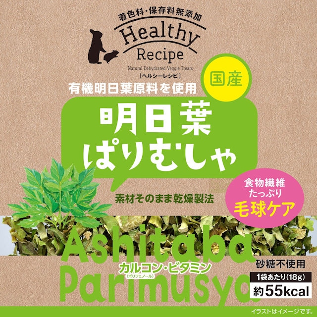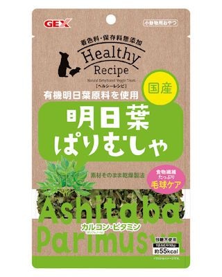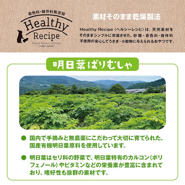 ※通販での取り扱いを開始しました。国内で手摘みと無農薬にこだわって大切に育てられた、国産有機明日葉原料を使用。明日葉はセリ科の野菜で、明日葉特有のカルコン(ポリフェノール)やビタミンなどの栄養素が豊富に含まれており、嗜好性も抜群の素材です。●Healthy Recipe(ヘルシーレシピ)は、天然素材をそのままシンプルに乾燥させた、砂糖・着色料・保存料不使用の安心してうさぎ・小動物に与えられるおやつです。●国産●カルコン(ポリフェノール)・ビタミン●食物繊維たっぷり毛球ケア成分:
